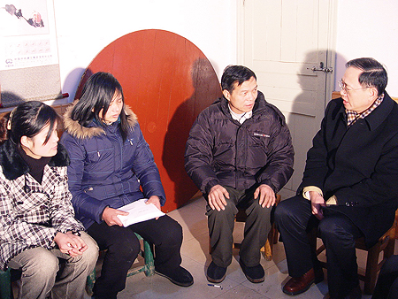 2008年2月5日,太保集團(tuán)總經(jīng)理霍聯(lián)宏冒著嚴(yán)寒趕到熊大勇家中慰問英雄的父 母,代表全體太保干部員工向英雄父母致敬(從右至:霍聯(lián)宏、英雄父親、英雄母親、英雄姐姐)。