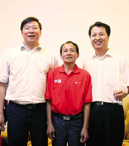 8月11日晚,張湘祥的父親張雨和(中)穿著張湘祥參加悉尼奧運(yùn)會(huì)的服裝,與壽險(xiǎn)福建龍巖 中心支公司前來道賀的領(lǐng)導(dǎo)合影留念,共同分享張湘祥奪冠的喜悅。