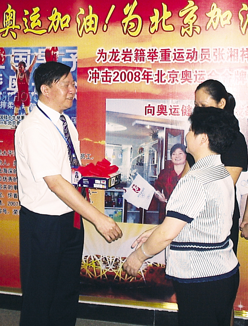 張湘祥的母親黃玉曼(右)赴京之前,龍巖中心支公司總經(jīng)理蔡霖(左)向其贈(zèng)送數(shù)碼相機(jī),并 為張湘祥加油,預(yù)祝他在比賽中取得成功。