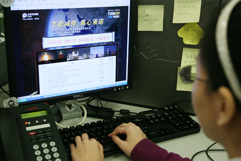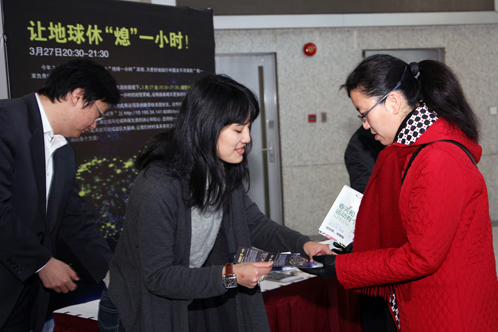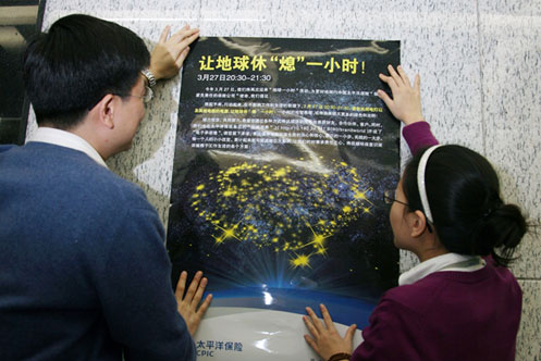 2010年3月26日一早,太平洋保險的志愿者在總部大樓向員工發(fā)放“地球一小時”活動宣傳資料。