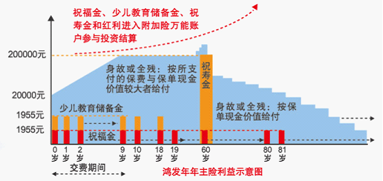 1、祝福金:自合同生效日起及以后的每個(gè)合同生效日對(duì)應(yīng)日,每年可領(lǐng)取1955元祝福金,直至終身。