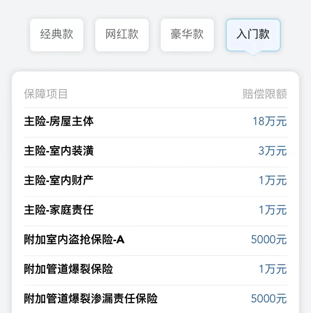 其次,家財險的保額按項目分類(如下圖所示)