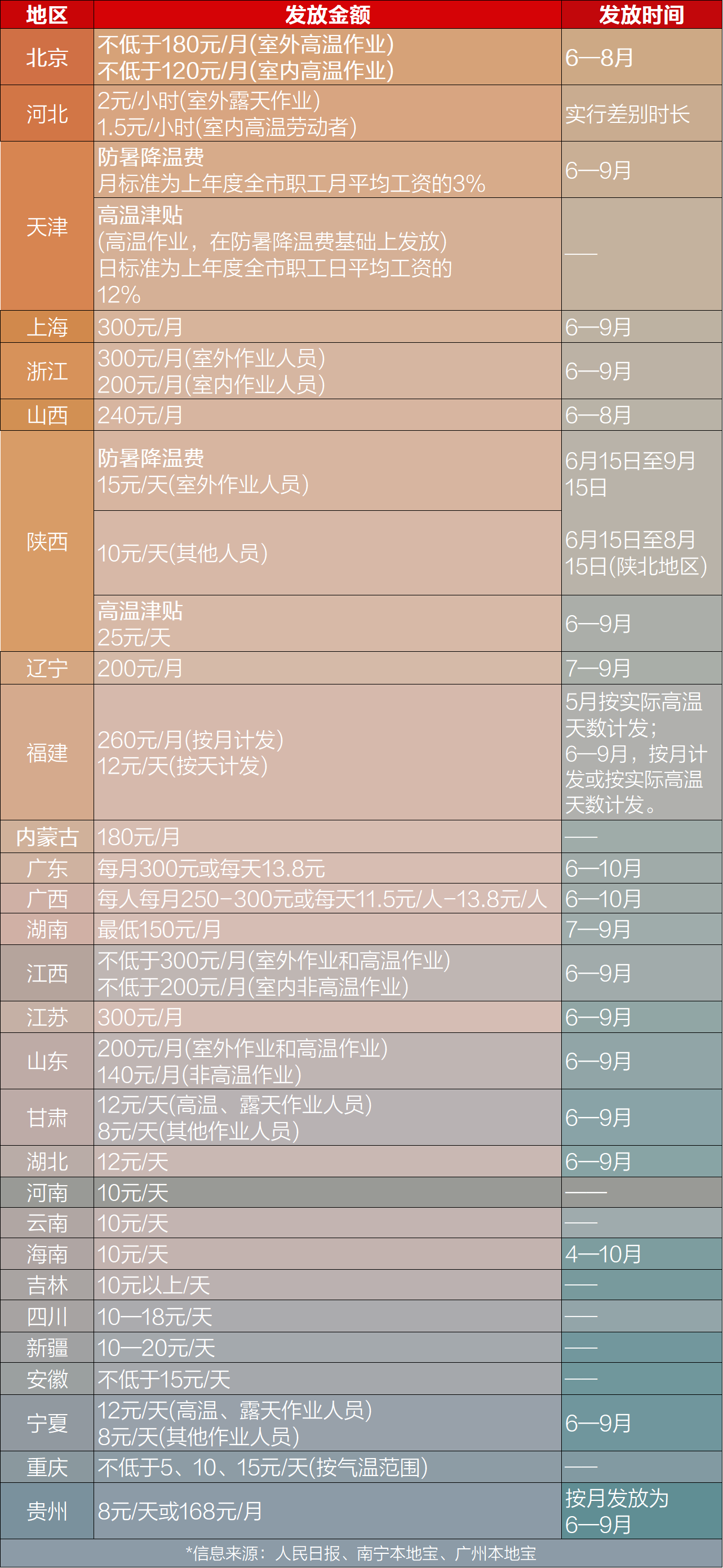 每個(gè)地區(qū),高溫津貼的領(lǐng)取時(shí)間、金額會(huì)有所不同,一般來說是有6、7、8、9四個(gè)月。