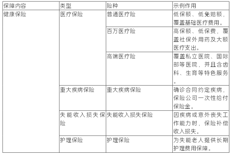 2.健康保險(xiǎn)可以分為醫(yī)療保險(xiǎn)、重大疾病保險(xiǎn)、失能收入損失保險(xiǎn)以及護(hù)理保險(xiǎn)。