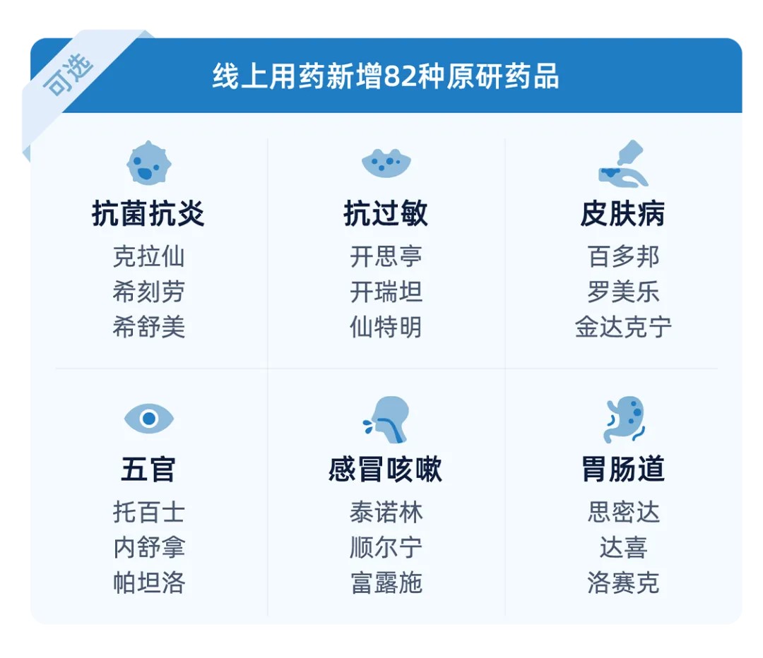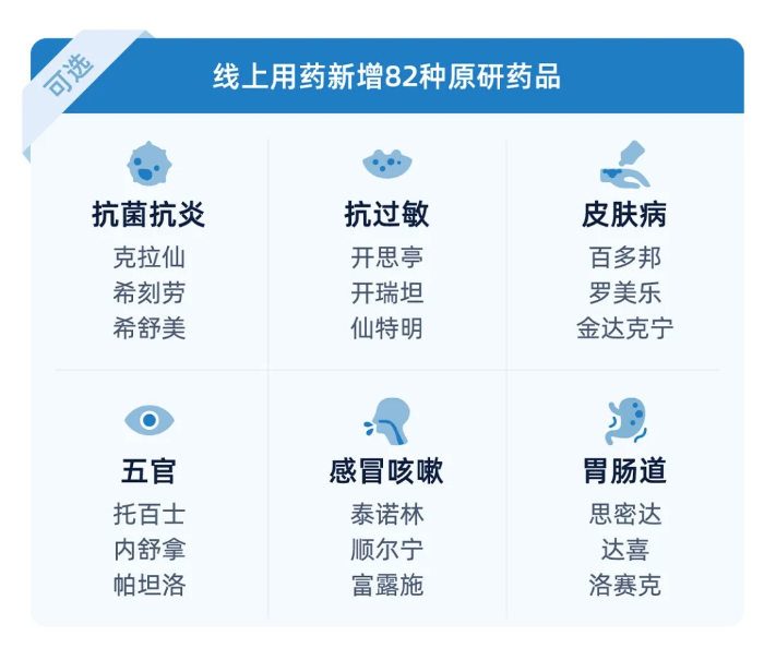 門(mén)診原研藥免費(fèi)新增82種,療效更好,比如我們常用的希舒美、達(dá)喜、開(kāi)瑞坦等,日常用藥品質(zhì)直接拉滿。