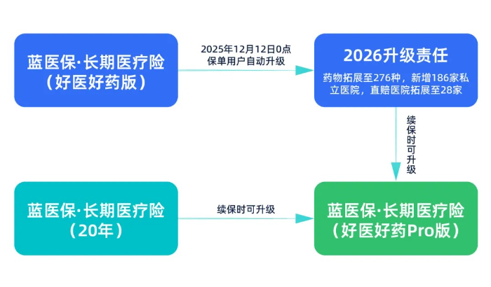 A1:藍醫(yī)?!らL期醫(yī)療險(20年)暫時不支持升級為藍醫(yī)保·長期醫(yī)療險(好醫(yī)好藥版),藍醫(yī)?!らL期醫(yī)療險(好醫(yī)好藥版)從12月12日0點起,太平洋健康險官方平臺、太平洋保險官網(wǎng)&APP、三方渠道/平臺投保的保單用戶無需任何操作,都已免費自動升級為2026新責任,升級后才能按照新責任來理賠。