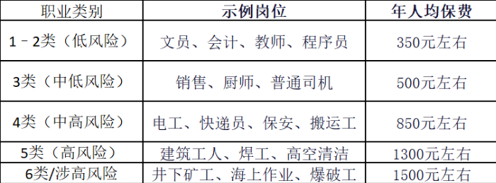 團體意外險的保費受職業(yè)類型影響較大,以50萬身故/傷殘保額+5萬意外醫(yī)療(不限社保)為例,市場上各職業(yè)類別的年人均保費情況如下: