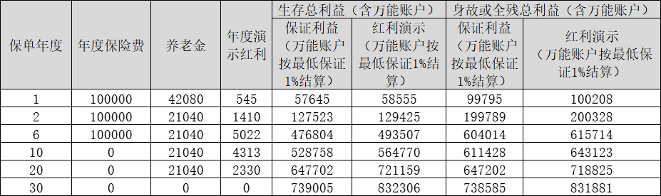 王女士,60周歲,為自己投保了10份“太保鴻壽年年金保險(xiǎn)(分紅型)”(簡(jiǎn)稱“鴻壽年年”),年交保費(fèi)100000元,6年交,養(yǎng)老金領(lǐng)取期間選擇30年,保險(xiǎn)期間為至養(yǎng)老金領(lǐng)取起始日起第三十個(gè)合同生效日對(duì)應(yīng)日前一日24時(shí)止,基本保險(xiǎn)金額21040元,養(yǎng)老金領(lǐng)取方式選擇年領(lǐng),紅利領(lǐng)取方式為累積生息。