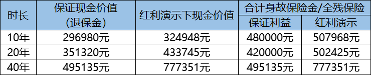 王先生保單利益包括身故保險金或全殘保險金,以及紅利。其演示利益如下: