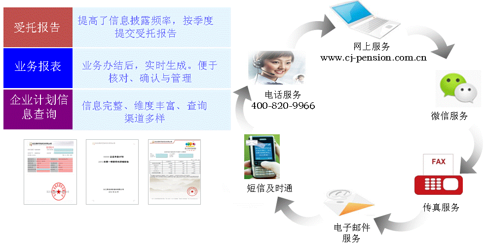 為保證客戶及時了解計劃運作情況,長江養(yǎng)老利用網上、電話、短信、電子郵件、微信等多種現(xiàn)代化的通訊方式提供全方位的查詢披露服務,并能根據(jù)客戶需要量身提供個性化報表服務。企業(yè)還可自助定制短信及郵件信息種類,長江養(yǎng)老提供包括業(yè)務辦理結果提醒、服務信息通知、問題件提醒等在內的短信及郵件服務。