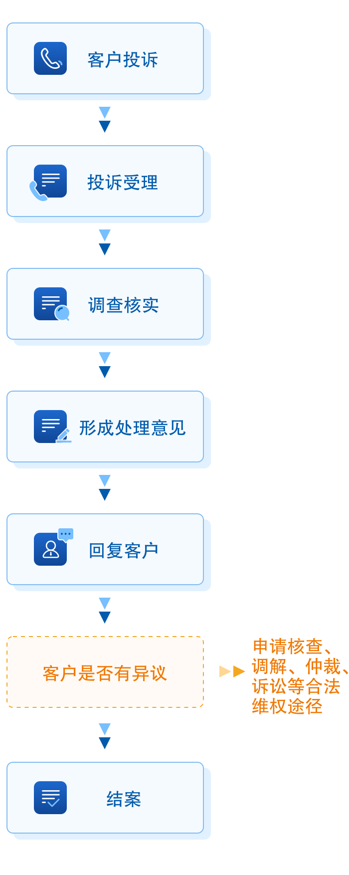 注:如果您對我們分支機(jī)構(gòu)消費(fèi)投訴處理結(jié)果有異議的,可以自收到處理決定之日起30日內(nèi)向其上級機(jī)構(gòu)書面申請核查。核查機(jī)構(gòu)應(yīng)當(dāng)對消費(fèi)投訴處理過程、處理時限和處理結(jié)果進(jìn)行核查,自收到核查申請之日起30日內(nèi)作出核查決定并告知投訴人。另外,您也可以通過調(diào)解、仲裁、訴訟等合法維權(quán)途徑維護(hù)您的權(quán)益。